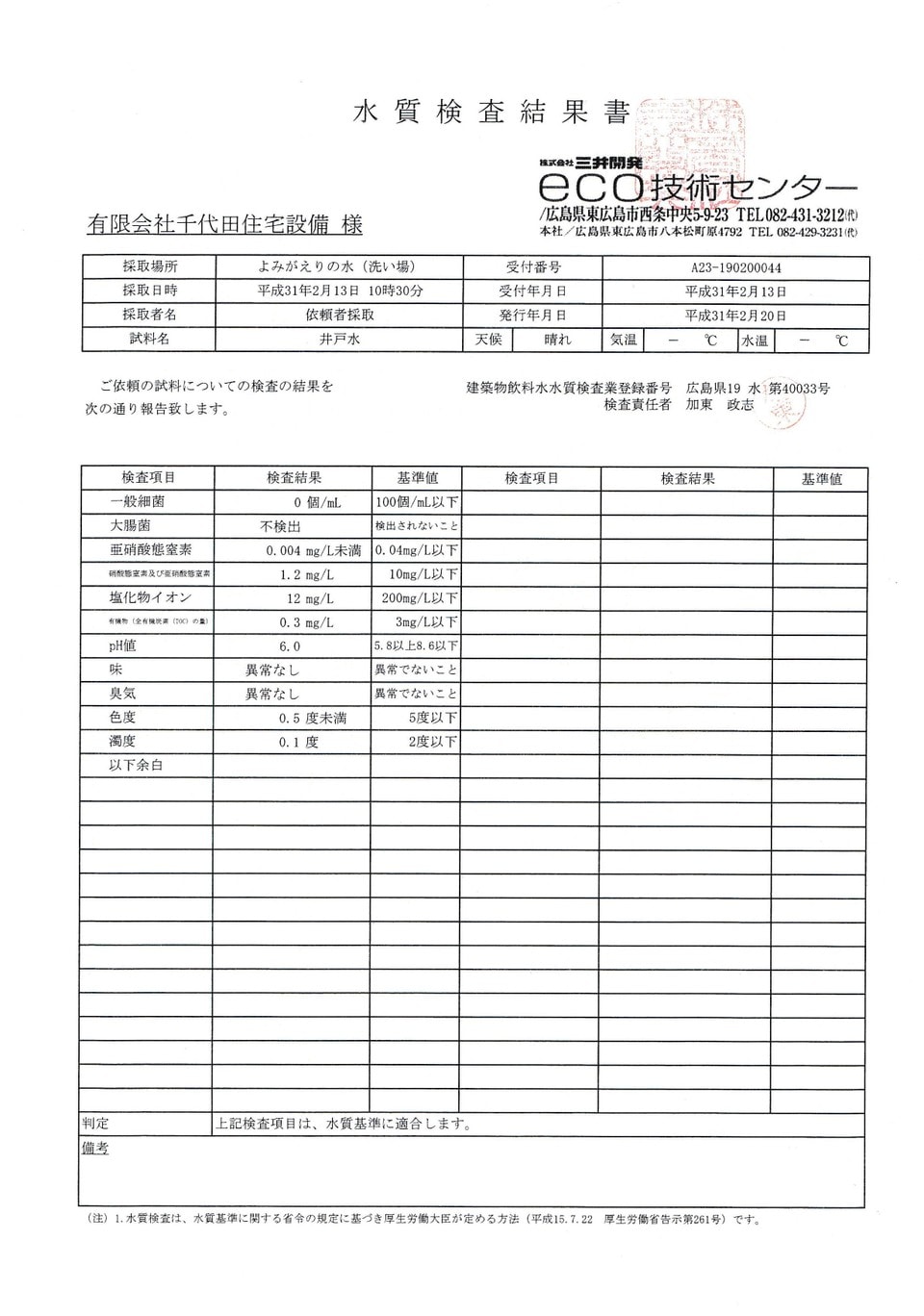 平成31年3月23日 取水場と容器洗い場の水質検査の結果です。