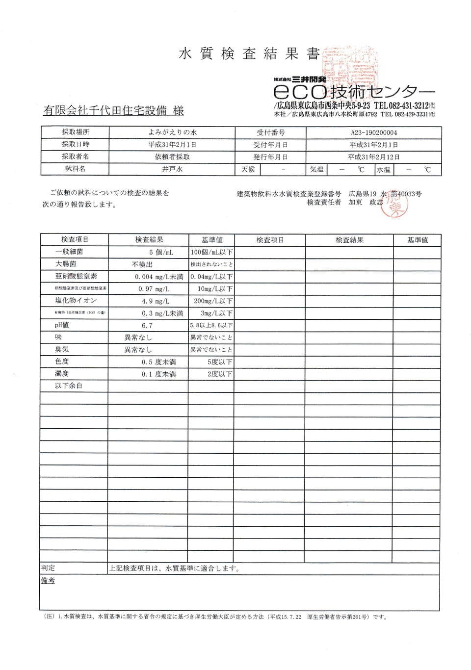 平成31年3月23日 取水場と容器洗い場の水質検査の結果です。