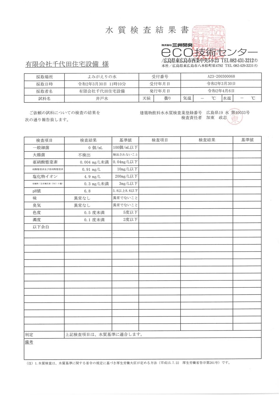 令和2年4月6日発行 取水場の水質検査の結果です。